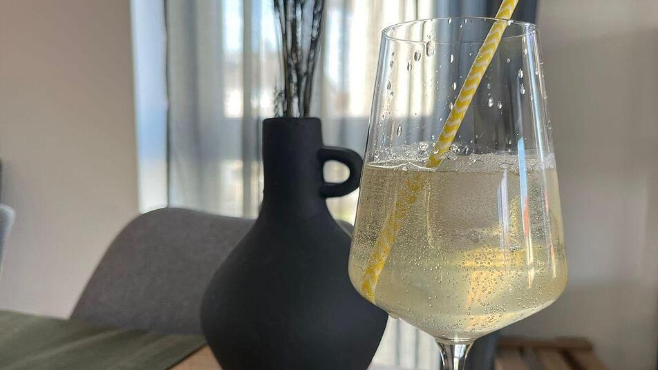 - Anschließend Weißwein, Tonic Water und Zitronensaft nacheinander in das Glas geben.