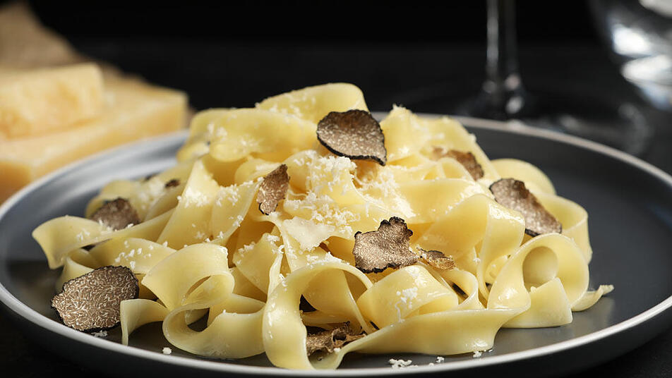 - Jetzt die fertig gekochte Pasta in die Soße geben, miteinander vermengen und dann portionsweise auf Teller geben. Mit Parmesan bestreuen und mit einem Trüffelhobel den Trüffel in Scheiben hobeln und darübergeben.