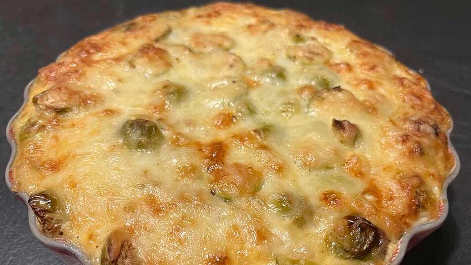- Eine Auflaufform einfetten. Zuerst die Kartoffelscheiben hineinschichten und mit Salz und Pfeffer würzen. Die gedünsteten Zwiebeln darauf verteilen. Anschließend den Rosenkohl darauf geben und leicht pfeffern. Die vorbereitete Eiermilch gleichmäßig darüber gießen und den restlichen Käse darüberstreuen.
