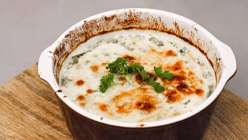 - Eine Auflaufform mit Butter ausstreichen und die Spargelmasse einfüllen. Anschließend mit dem übrigen Käse bestreuen und für 10 Minuten bei 180°C überbacken.