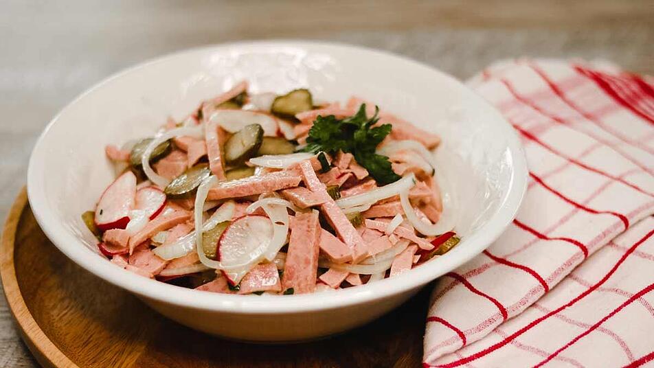 - Die Zwiebeln, Radieschen und die Gewürzgurken in Scheiben schneiden. Die Wurst ebenfalls in längliche Streifen schneiden. Anschließend alles vermischen.
