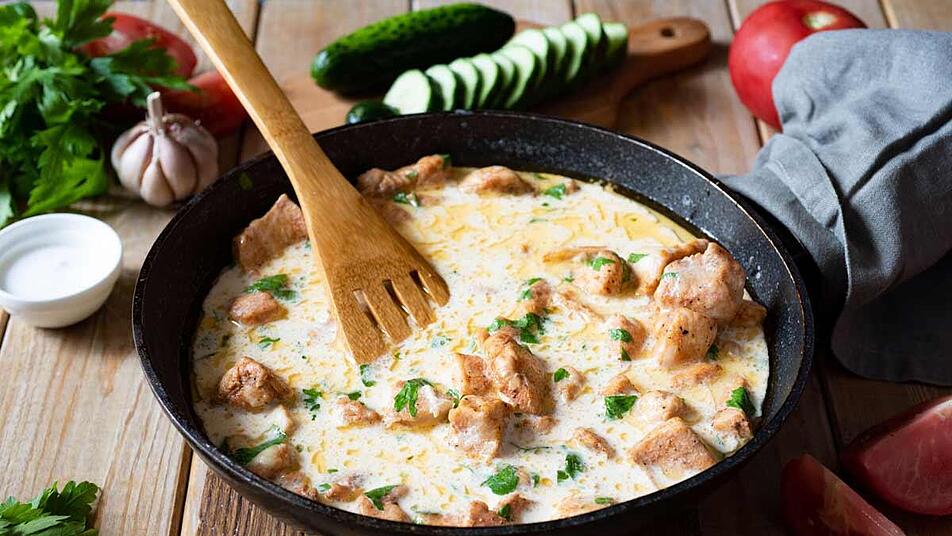 - Kurz vor dem Servieren das Gulasch erneut auf kleiner Stufe erhitzen. Die Sahne leicht aufschlagen und in das Gulasch einrühren. Abschließend mit Salz und Pfeffer nochmal kräftig würzen.