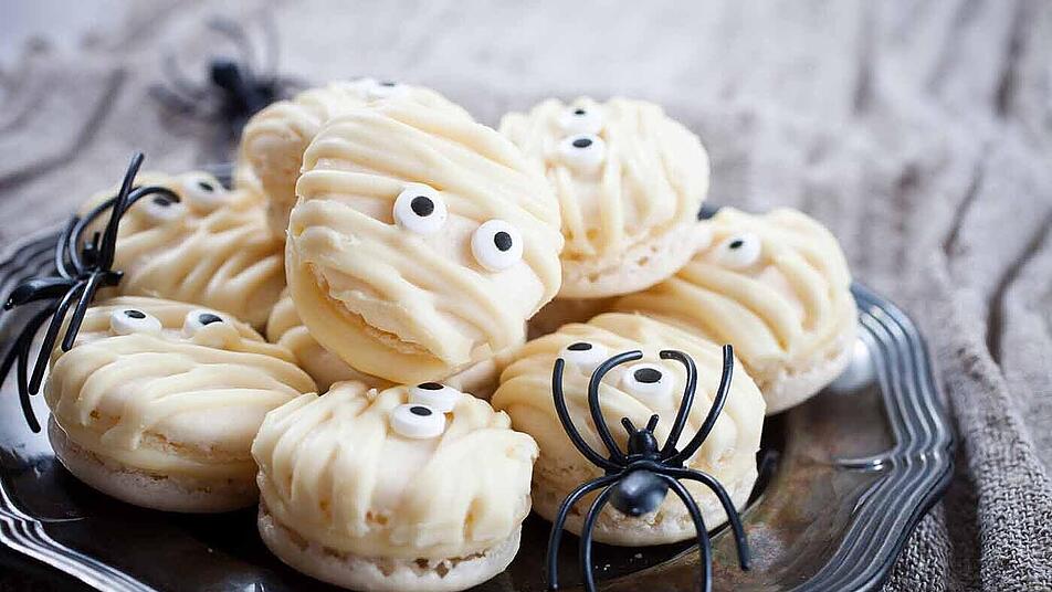 - Zur Verzierung wird nun die restliche Schokolade geschmolzen und in einen Gefrierbeutel gefüllt. Eine Ecke wird schmal abgeschnitten, sodass nur ein feiner Strahl Schokolade herauskommt. Mit diesem werden in eine Richtung feine Fäden gespritzt - und schon sehen diese aus wie kleine Mumien. Die Zuckeraugen machen das Bild perfekt. Vor dem Genießen nur noch die Schokolade fest werden lassen.