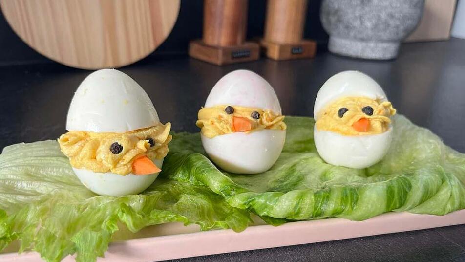 - Für die Dekoration: Karotten schälen und in kleine, dünne Streifen schneiden. Die Karottenspalten in die Eigelb-Mischung als Schnabel stecken und mit den Pfefferkörnern die "Augen" dekorieren.