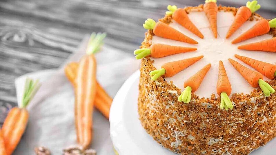 - Den Karottenkuchen aus der Springform nehmen, nachdem er abgekühlt ist. Den Puderzucker mit Zitronensaft und etwas Wasser zu einem Zuckerguss vermischen und den Karottenkuchen damit bestreichen. Anschließend den Krokant an die noch feuchte Glasur am Rand drücken und die Marzipan-Karotten auf den Kuchen legen.
