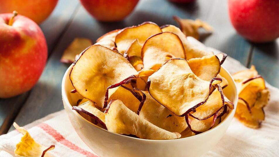 - Die Apfelchips sind fertig, wenn sie knusprig und leicht gebräunt sind. Bestreue die noch warmen Apfelchips mit Zimt, so hält sich das Gewürz am besten. Du kannst auch mit anderen Gewürzen experimentieren, aber Zimt passt besonders gut!