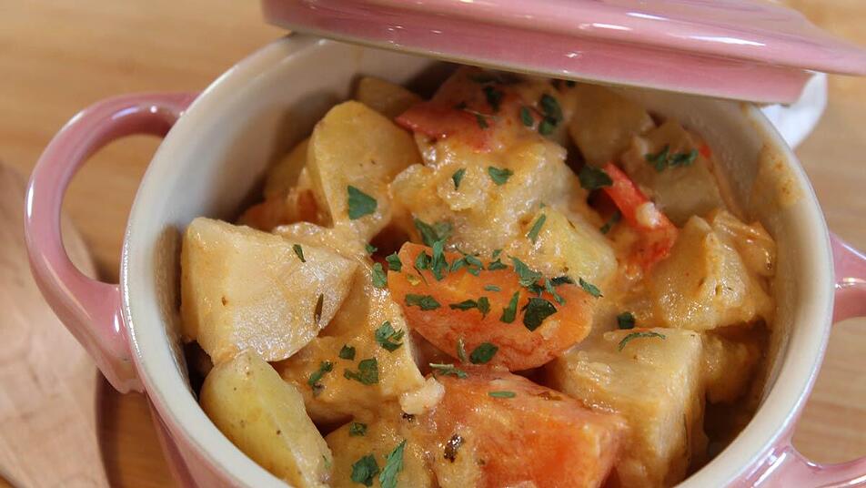 - Nach einer halben Stunde ist das Gemüse durch, dann die Creme fraiche unterrühren und mit den Gewürzen abschmecken.