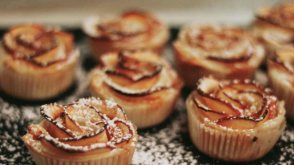 - Ofen auf 200 Grad Ober-/ Unterhitze vorheizen. Die aufgerollten Apfelrosen in die Mulden des Muffinblechs legen so lange rollen, bis das Blech voll ist. Anschließend für 30-35 Minuten im Ofen backen. Achtung: Falls die oberen Apfelscheiben dunkel werden, einfach die letzten Minuten mit einer Alufolie abdecken. Auskühlen lassen und mit Puderzucker bestreuen!