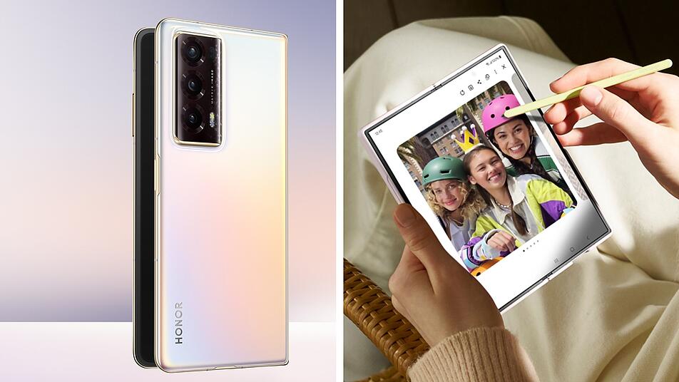 Das Honor Magic V2 zählt zwar nicht zu den bekanntesten Foldables, geht in vielen Vergleichen aufgrund seiner technischen Spezifikationen jedoch als Testsieger hervor und ist auch bei den Kunden sehr beliebt. Mit einem 512 GB großen internen Speicher, der durch Speicherkarten erweitert werden kann, bietet das Gerät ausreichend Platz für alle wichtigen Dateien. Zudem besitzt das Gerät über einen Dual-SIM Slot, wodurch ihr beispielsweise mehrere Verträge nutzen könnt. Zusammengeklappt hat das Handy lediglich eine Dicke von 9,9 mm, wodurch es nicht sperrig wirkt und auch für den allgemeinen Gebrauch als Smartphone problemlos im Alltag verwendet werden kann. Mit dem speziell entwickelten Betriebssystem MagicOS (Android) und dem kraftvollen 16 GB großen Arbeitsspeicher wird die maximale Leistung aus dem Gerät geholt und ihr könnt problemlos mehrere sowie aufwändigere Apps parallel laufen lassen. Aktuell bekommt ihr bei Media Markt sogar einen Rabatt von 27 Prozent und spart beim Kauf des Honor Magic V2 rund 500 Euro* auf das Gerät. Durch die moderne Technik, den günstigen Preis und die KI gestützte Nutzung des Geräts, ist das Honor Magic V2 unser Sieger aus dem Vergleich.
