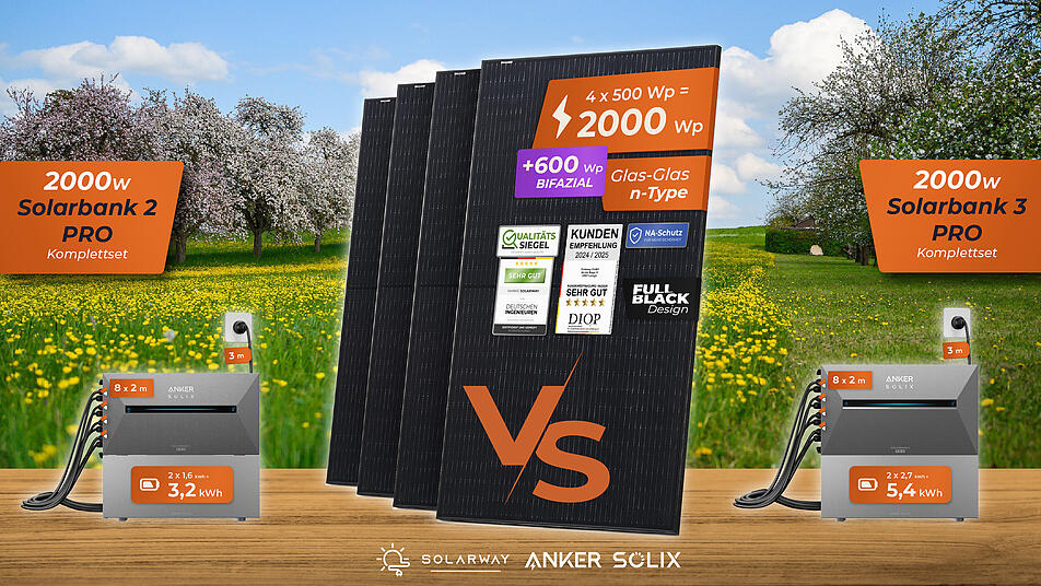 "Solarway Balkonkraftwerk 2000 Watt Pro" - mit Speicher Anker SOLIX Solarbank 3 (2,68 kWh) 800 Euro günstiger