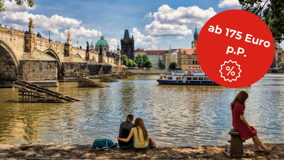 Unser exklusiver Reise-Deal beinhaltet zwei Übernachtungen im 4-Sterne-Hotel inkl. Frühstück und ein 3-Tages-Ticket für den ÖPNV. Du hast die Qual der Wahl, denn für deinen zweiten Reisetag darfst du aus vier verschiedenen Erlebnis-Aktivitäten wählen. Ob für Verliebte, beste Freundinnen oder zum Junggesellenabschied: Wer Last Minute im August Lust auf einen Trip nach Prag hat, wird hier fündig. Wähle zwischen einer Schifffahrt ins Prager Venedig inkl. Besuch des Karlsbrückenmuseums, einer geführten Stadtrundfahrt, einer Bierparty im berühmten U Fleku oder einem Besuch in einem Prager Schwarzlichttheater.
