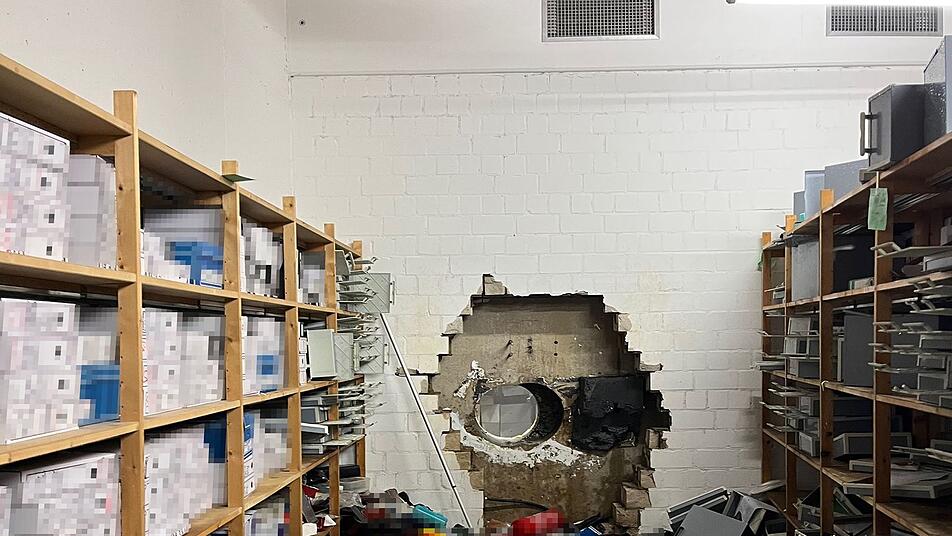 Auf einem von der Polizei veröffentlichten Foto sind zahlreiche auf den Boden geworfene Akten in dem Archivraum zu sehen. An den Wänden rechts und links stehen Holzregale. In der Mitte an der Wand klafft das kreisrunde Loch zum Tresorraum in der Wand. Auch zahlreiche Ziegelsteine fehlen an der Stelle.